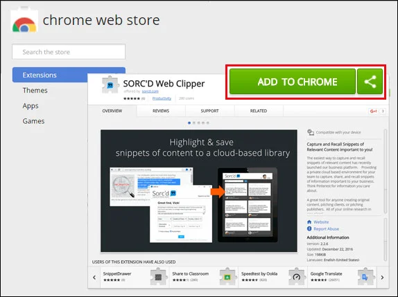 Go to the Chrome Store and search for Sorc'd. Click on ADD TO CHROME. The Sorc'd Web Clipper Chrome extension empowers you to highlight text from any website and save to your Sorc'd account. We save the links to all of your sources, so you can easily reference them when you want to.