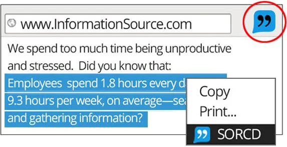 Once installed, simply highlight the text you wish to save and right click. In the drop down, click on Sorc'd. The Sorc'd logo will appear in the upper right-hand of your browser window.