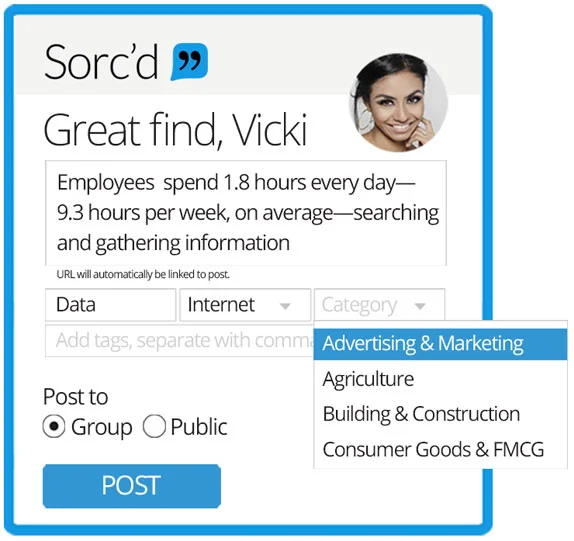 A small window will pop up with the text you have highlighted and ask how you want to categorize or tag the snippet to your Sorc’d account. You can make the post public or private. The private option is available to premium and business users. Categories are fixed, but tags are not. Tags may include anything you want, but categories are a good way to keep snippets organized at a top level.